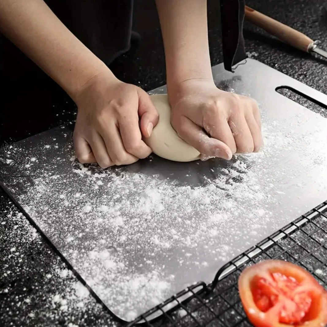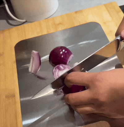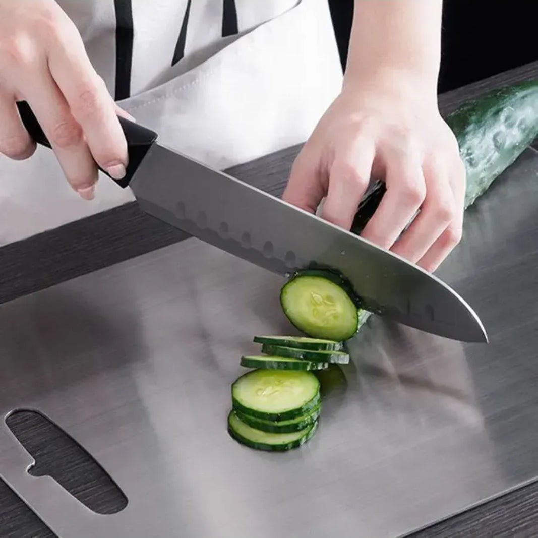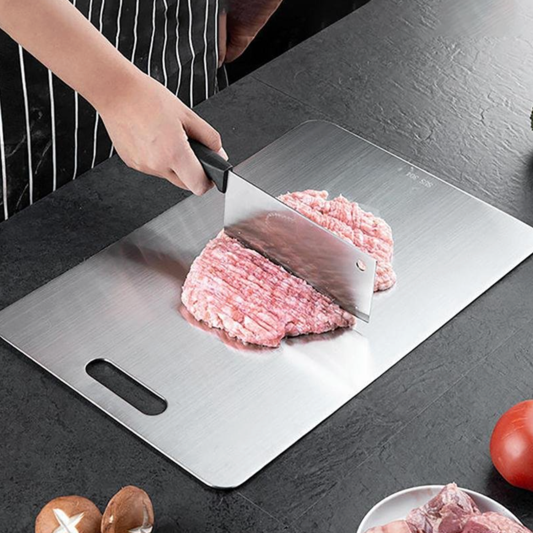 Edelstahl 304 ist antibakteriell und lässt keine Gerüche oder Flecken zurück. Selbst nach Knoblauch, Zwiebeln oder rohem Fleisch bleibt das Brett geruchsfrei. Keine Bakterien, kein Schimmel, keine Sorgen.